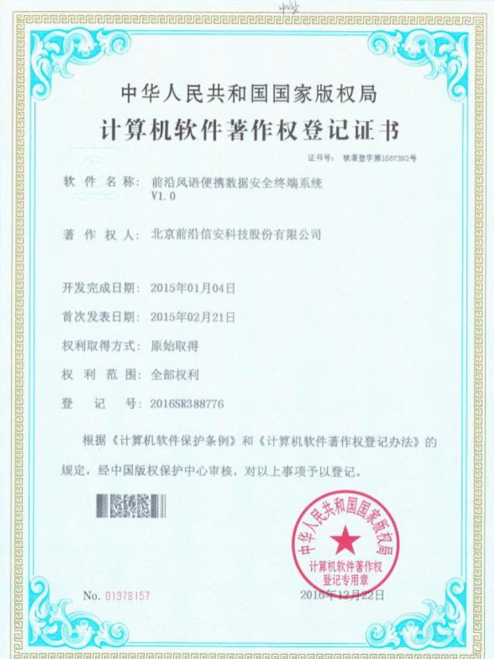 软件著作权证书--前沿风语便携数据安全终端系统V1.0